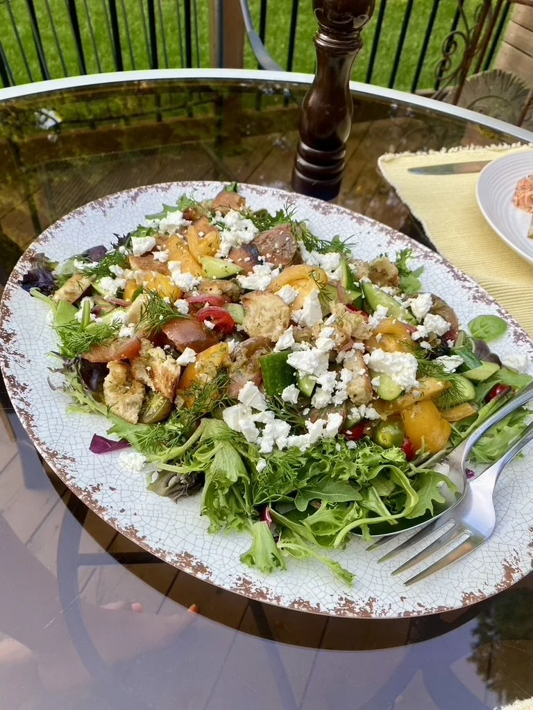 - Arrange mixed greens on a large serving platter. Spoon tomato-bread mixture over top and add crumbled feta. Garnish with sprigs of dill.